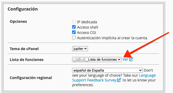 - Vuelve a WHM e ingresa a Editar un paquete. Asegúrate de que el paquete asignado a la cuenta tenga en "Lista de características" la lista de funciones que creamos (o editamos) en el punto anterior.