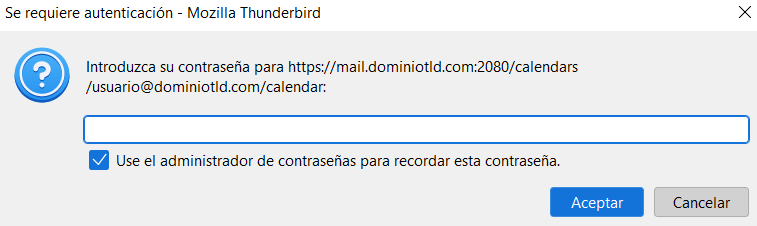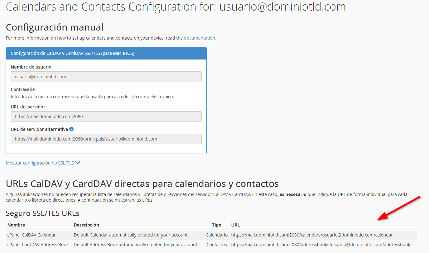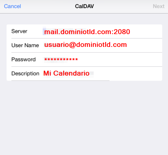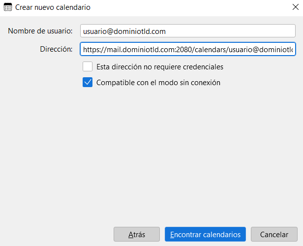 - Completa ahora con los datos de nuestra cuenta. Tendremos que desglosar la URL y separarla en varias partes. Si tomamos de ejemplo la URL "https://mail.dominiotld.com:2080/calendars/usuario@dominiotld.com/calendar", quedaría de esta forma:
