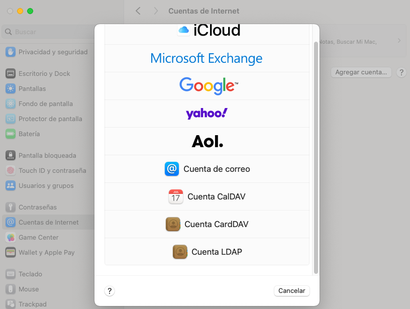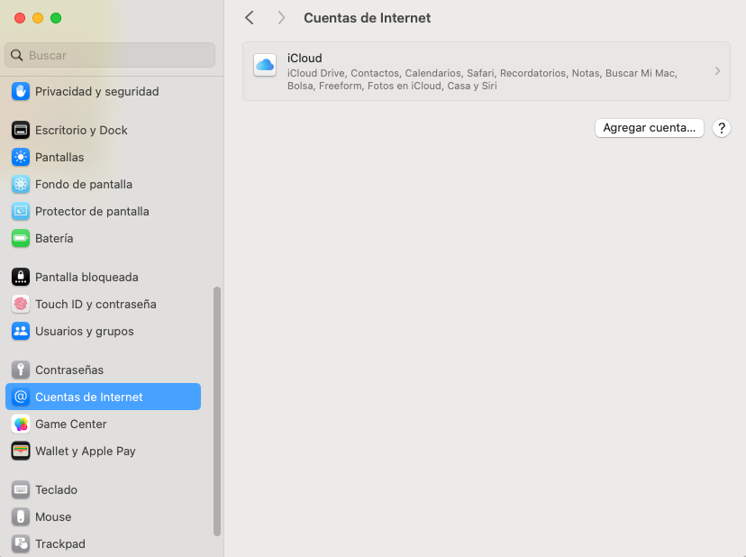 - Abre la Configuración del sistema, y ve a Cuentas de Internet. Luego presiona el botón Agregar cuenta.