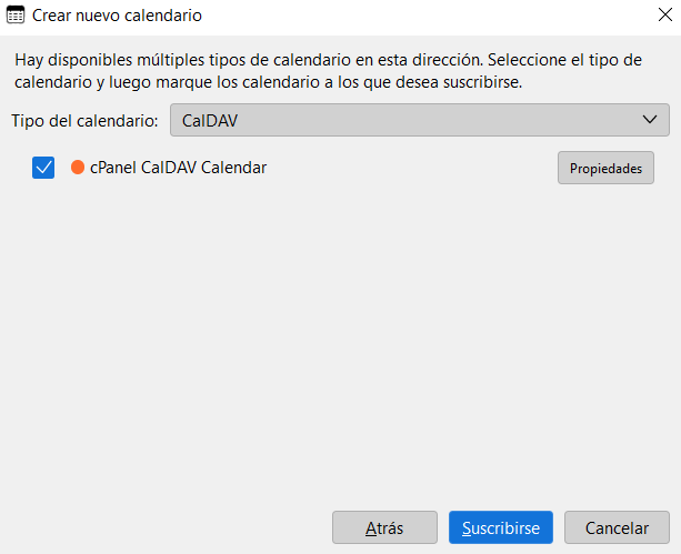 - En tipo, selecciona CalDAV y tilda el calendario correspondiente. Luego, dale al botón Suscribir.