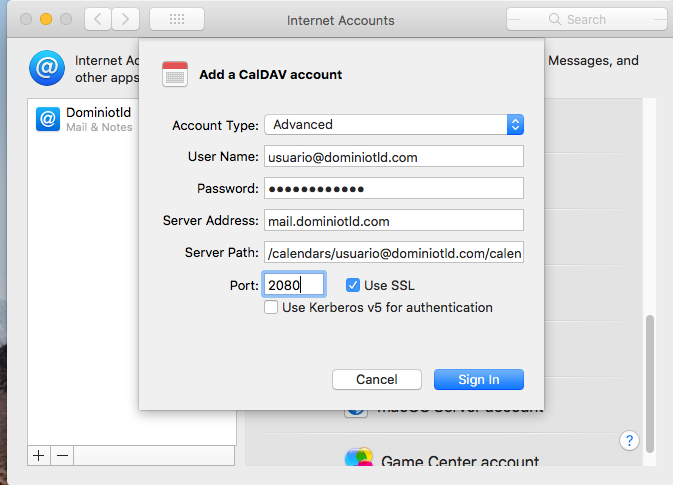 - Selecciona Advanced y completa con los datos de nuestra cuenta. Tendremos que desglosar la URL y separarla en varias partes. Si tomamos de ejemplo la URL "https://mail.dominiotld.com:2080/calendars/usuario@dominiotld.com/calendar", quedaría de esta forma: