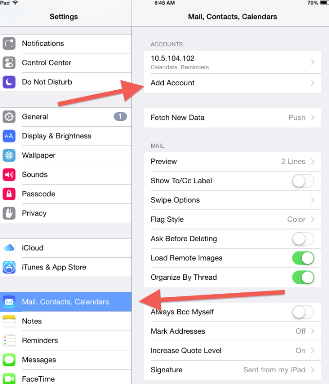 - En tu dispositivo mobile, ingresa a "Settings" → Mail, Contacts, Calendars → Add Account.
