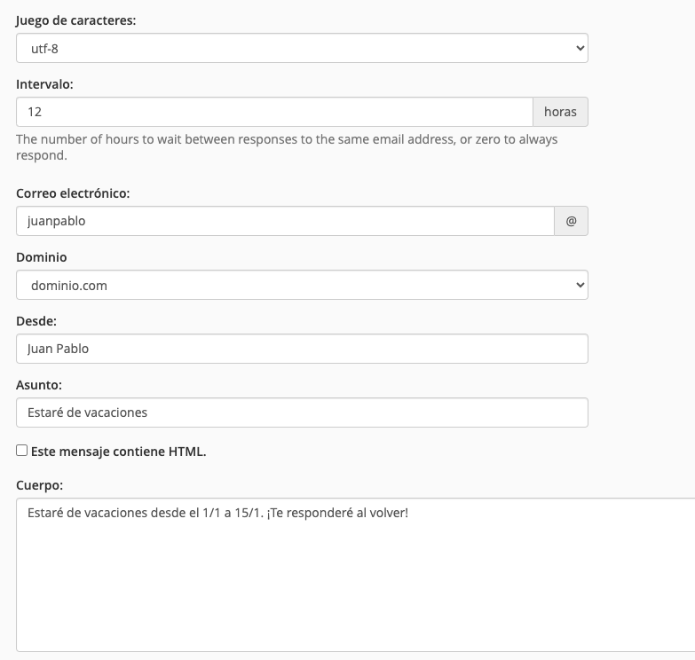 Intervalo: la cantidad de horas a esperar entre respuestas a la misma dirección de correo electrónico, por ejemplo "12". Aplicará si una persona escribe a la misma casilla mientras está el auto contestador activado, para que no se repita por ese tiempo.