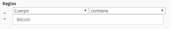 - Debajo personaliza el criterio de filtrado. Ingresaremos la palabra Bitcoin en el campo de texto y definiremos en el menú desplegable dónde queremos que el filtro busque (Asunto, Cuerpo, De, Para) y el nivel de exactitud.
