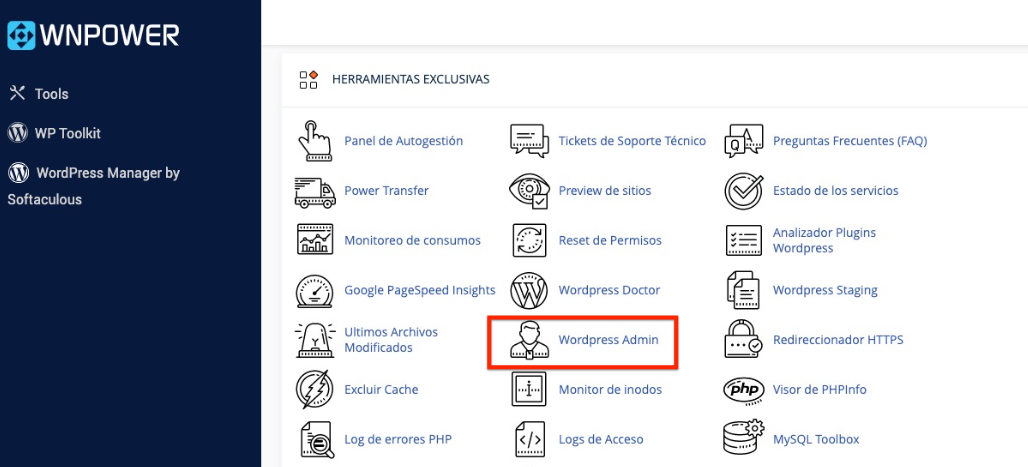 - Busca y ve a la herramienta WordPress Admin, dentro del apartado Herramientas Exclusivas.