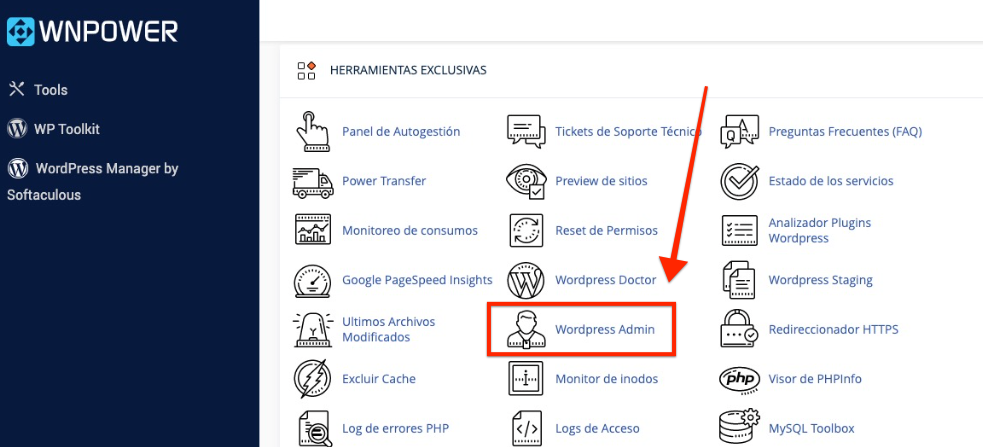 - Ahora vuelve a cPanel y ve a la herramienta WordPress Admin de WNPower, ubicado dentro del recuadro Herramientas Exclusivas.