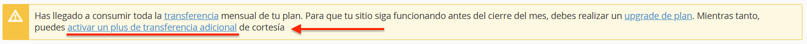 - Cuando te quedes sin transferencia aparecerá el siguiente mensaje en la cabecera de tu panel de control cPanel. Sólo debes hacer clic en Transferencia adicional.