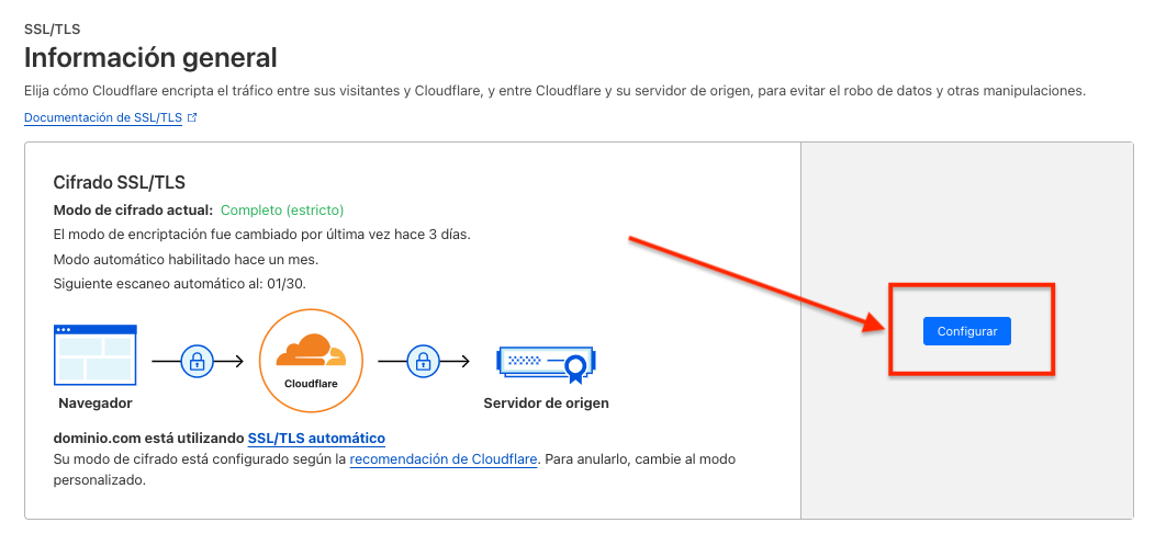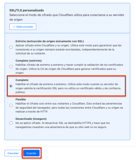 - Selecciona tu dominio y setea en "Full" tu certificado SSL.