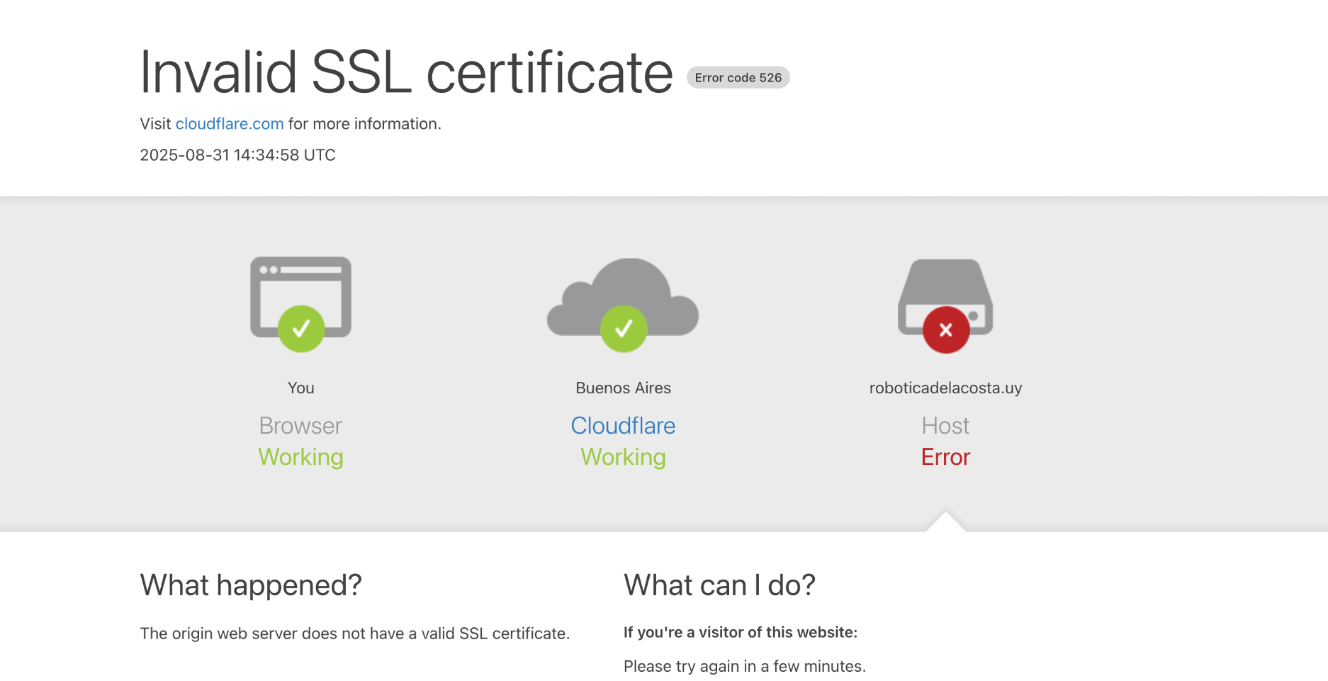 Si al ingresar a tu web estás recibiendo el error "Invalid SSL certificate" de Cloudflare, el origen es que Cloudflare no está pudiendo negociar correctamente con el certificado SSL del servidor web donde está alojado el sitio.
