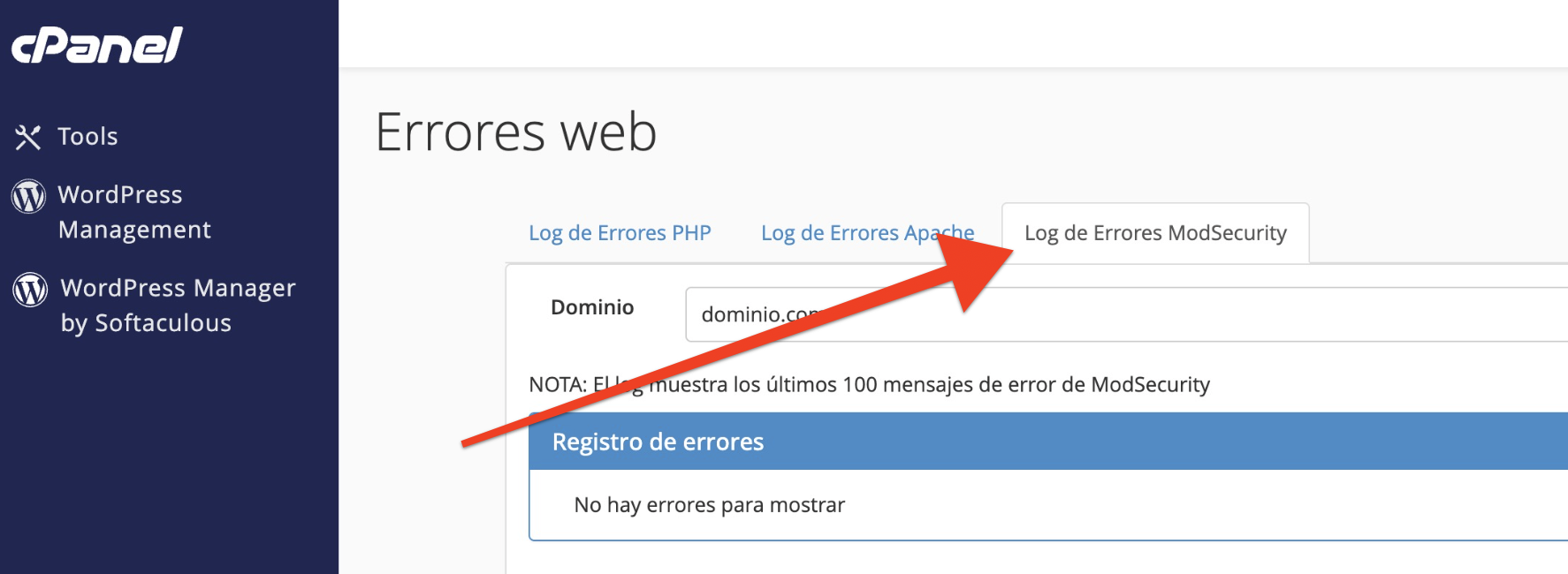 Nuestra herramienta de Errores web te va a permitir también revisar los errores de ModSecurity. Y se usa tan simple como lo ves aquí.