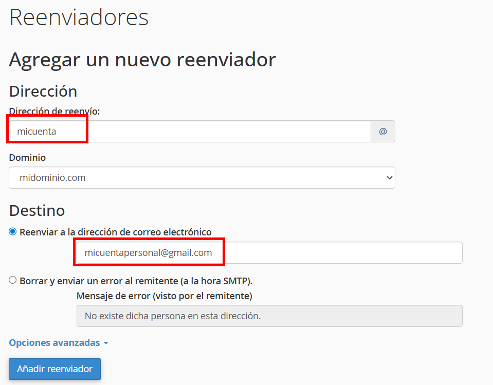 Los Reenviadores reenvían los correos recibidos a una dirección hacia otra que le indiques, no importa si la casilla destino está o no dentro del mismo dominio.